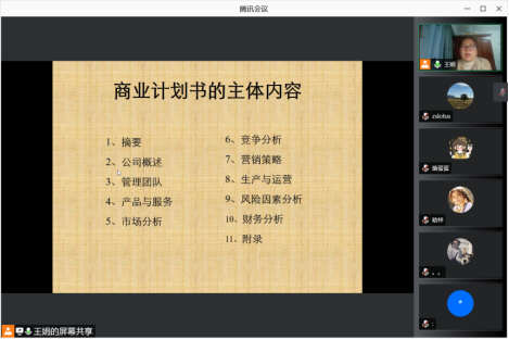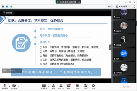 陈曦老师讲解的内容主要是:如何组建团队、团队成员如何分工、如何选择参赛项目等。王娟老师主要展开讲解如何撰写商业策划书、如何准备高质量的路演PPT等。